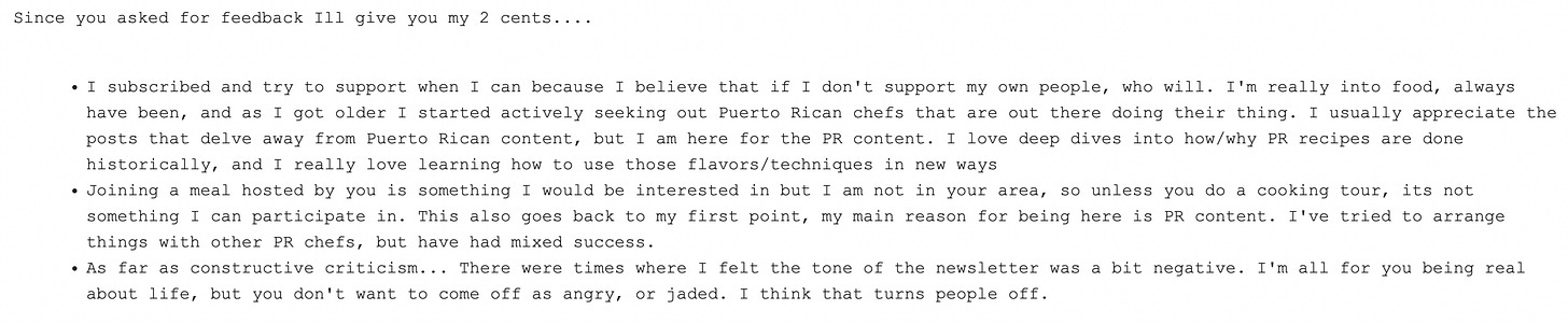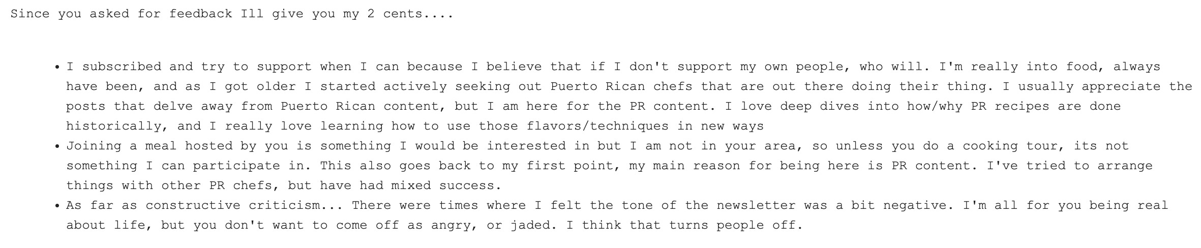 "As far as constructive criticism... There were times where I felt the tone of the newsletter was a bit negative. I'm all for you being real about life, but you don't want to come off as angry, or jaded. I think that turns people off."